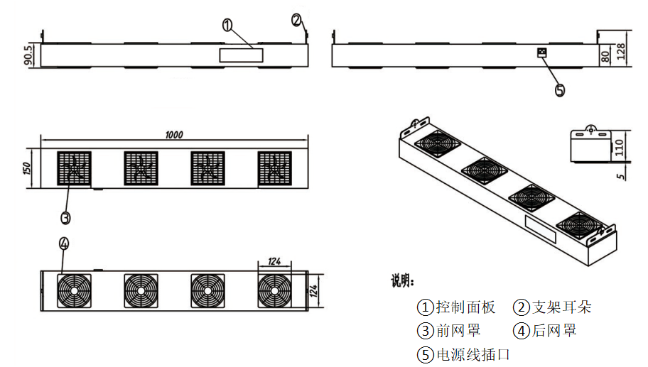 1000mm(L)*150mm(W)*80mm(H)(不含支架耳朵) |